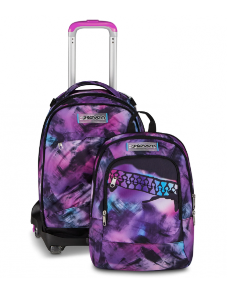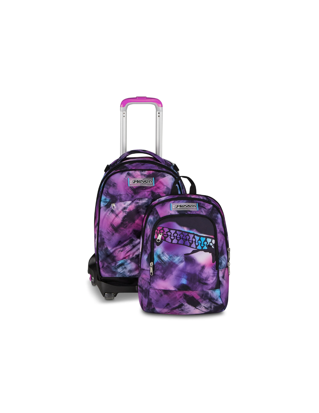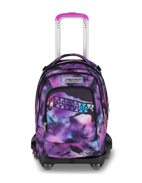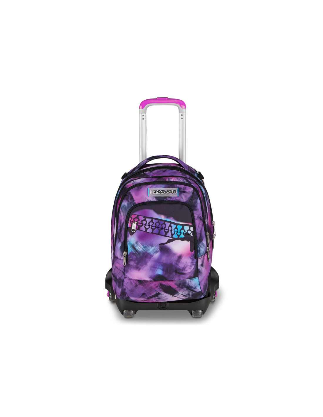 Il Trolley Seven è dotato del nuovo sistema a 8 ruote. Grazie alle 2 ruote anteriori puoi spingerlo senza inclinarlo, rendendo agevoli i piccoli spostamenti in classe o quando sei seduto al banco, mentre le 6 ruote posteriori facilitano la salita dei gradini, affrontandoli sempre con la giusta cautela. Lo zaino è capiente, da riempire con quello che ti serve: libri, quaderni per scuola, o il cambio per l'allenamento. Lo scomparto frontale, inoltre, si può staccare tramite zip ed essere usato come zainetto. Schienale e spallacci imbottiti inoltre rendono lo zaino comodo da indossare sulle spalle, mentre se lo agganci al carrello dotato di doppia barra telescopica, protezioni angolari e fondo rinforzato è maneggevole, stabile, pratico e sicuro da trascinare come trolley.