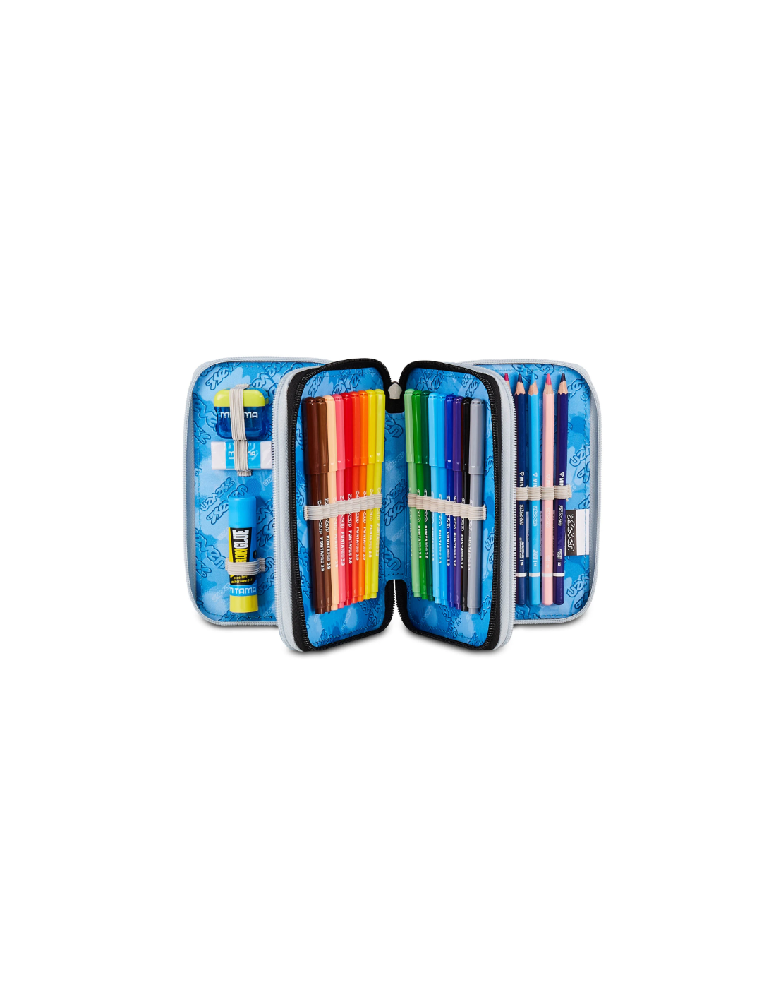- Contenuto astuccio 45 pezzi: 1 penna cancellabile blu Frixion, 1 penna sfera rossa, 18 pastelli a colori 4.0 esagonali Seven, 18 pennarelli superlavabili punta 3.0 mm Seven, 1 matita grafite esagonale HB, 1 colla gialla azzurra, 1 gomma bianca, 1 temperino barilotto 2 fori azzurro e giallo Seven, 1 righello trasparente azzurro, 1 matita bicolor rosso/blu Seven, 1 paio di forbici in metallo.